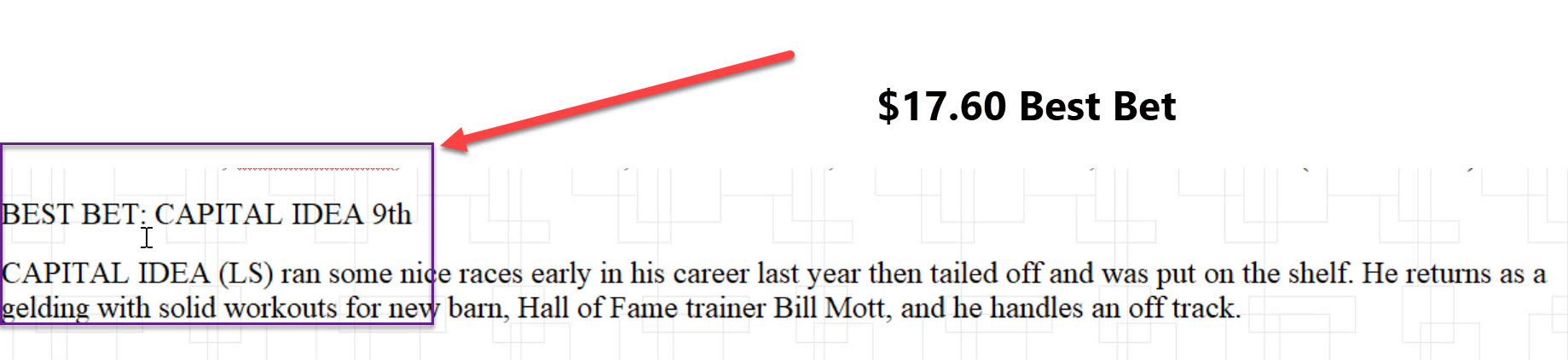 BEST BET: CAPITAL IDEA 9th CAPITAL IDEA (LS) ran some nice races early in his career last year then tailed off and was put on the shelf. He returns as a gelding with solid workouts for new barn, Hall of Fame trainer Bill Mott, and he handles an off track.