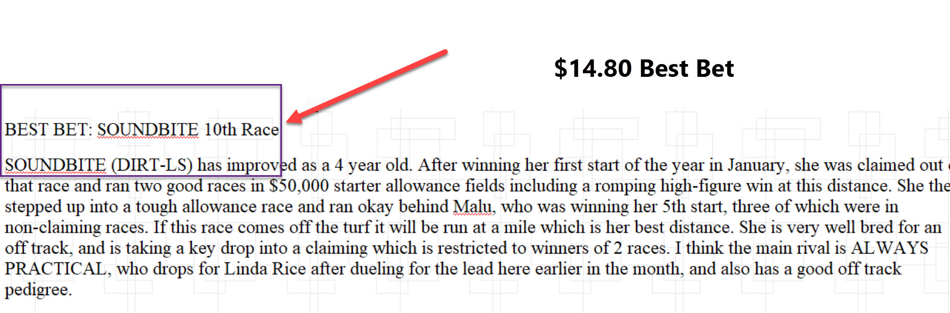 BEST BET: SOUNDBITE 10th Race SOUNDBITE (DIRT-LS) has improved as a 4 year old. After winning her first start of the year in January, she was claimed out of that race and ran two good races in $50,000 starter allowance fields including a romping high-figure win at this distance. She then stepped up into a tough allowance race and ran okay behind Malu, who was winning her 5th start, three of which were in non-claiming races. If this race comes off the turf it will be run at a mile which is her best distance. She is very well bred for an off track, and is taking a key drop into a claiming which is restricted to winners of 2 races. I think the main rival is ALWAYS PRACTICAL, who drops for Linda Rice after dueling for the lead here earlier in the month, and also has a good off track pedigree.